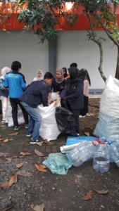 Para mahasiswa Teknik Lingkungan memungut dan mengumpulkan sampah